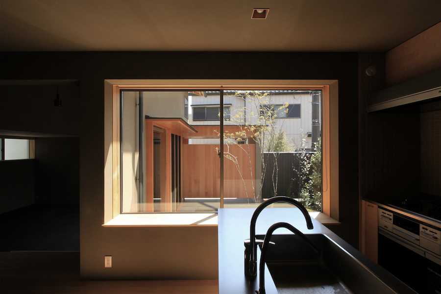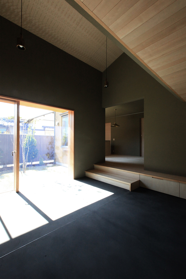 玄関から続くリビングは土間にして中庭とつなぎ、